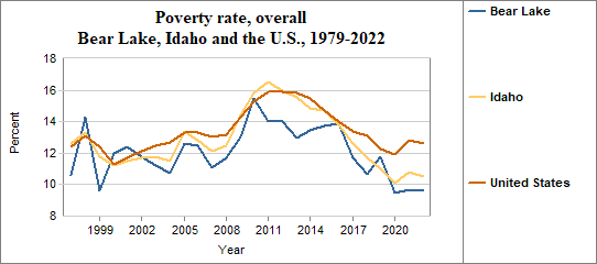 The poverty rate is the percentage of people living below the poverty level or “threshold.” Each year, the U.S. Office of Management and Budget establishes a series of poverty thresholds for different family sizes and ages of household heads. Among Bear Lake residents, the overall poverty rate . . .