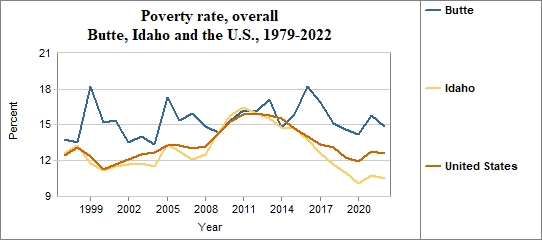 The poverty rate is the percentage of people living below the poverty level or “threshold.” Each year, the U.S. Office of Management and Budget establishes a series of poverty thresholds for different family sizes and ages of household heads. Among Butte residents, the overall poverty rate . . .