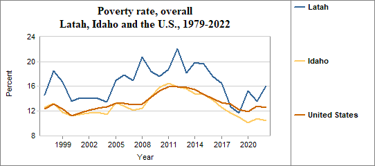 The poverty rate is the percentage of people living below the poverty level or “threshold.” Each year, the U.S. Office of Management and Budget establishes a series of poverty thresholds for different family sizes and ages of household heads. Among Latah residents, the overall poverty rate . . .