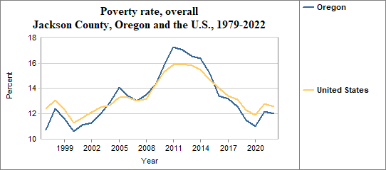 The poverty rate is the percentage of people living below the poverty level or “threshold.” Each year, the U.S. Office of Management and Budget establishes a series of poverty thresholds for different family sizes and ages of household heads. Among Jackson County residents, the overall poverty rate . . .