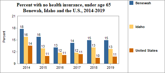 - 14.9 percent of the population under age 65, or 1,055.0 people, had no health insurance coverage compared to 12.7 percent in all of Idaho;