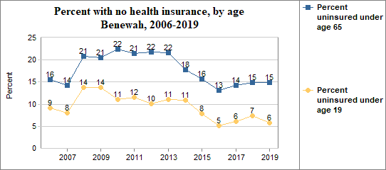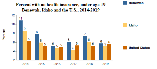 - 5.7 percent of children under the age of 19, or 119 children, had no health insurance coverage compared to 5.1 percent of all children in Idaho;