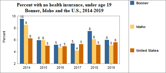 - 6.0 percent of children under the age of 19, or 562 children, had no health insurance coverage compared to 5.1 percent of all children in Idaho;