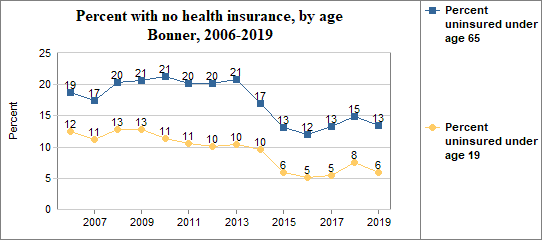 - 13.4 percent of the population under age 65, or 4,535.0 people, had no health insurance coverage compared to 12.7 percent in all of Idaho;