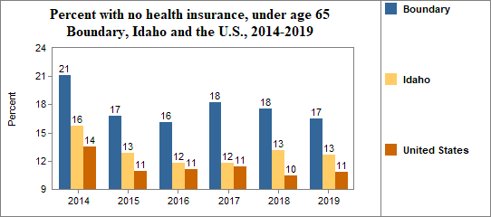 - 16.5 percent of the population under age 65, or 1,526.0 people, had no health insurance coverage compared to 12.7 percent in all of Idaho;