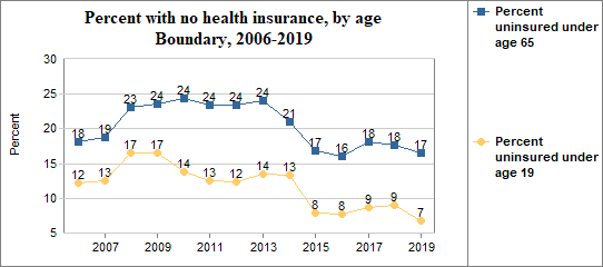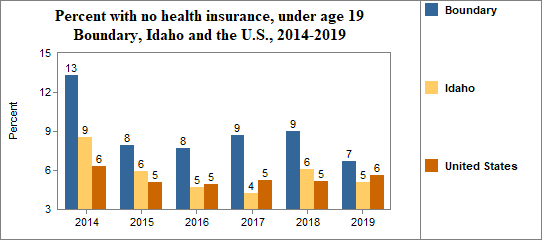 - 6.7 percent of children under the age of 19, or 193 children, had no health insurance coverage compared to 5.1 percent of all children in Idaho;