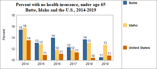 - 10.5 percent of the population under age 65, or 206.0 people, had no health insurance coverage compared to 12.7 percent in all of Idaho;