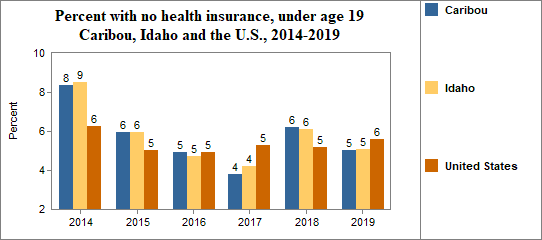 - 5.0 percent of children under the age of 19, or 108 children, had no health insurance coverage compared to 5.1 percent of all children in Idaho;