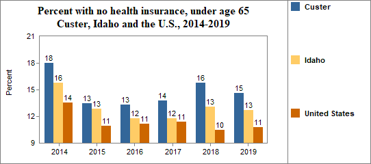 - 14.6 percent of the population under age 65, or 436.0 people, had no health insurance coverage compared to 12.7 percent in all of Idaho;