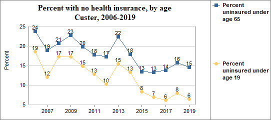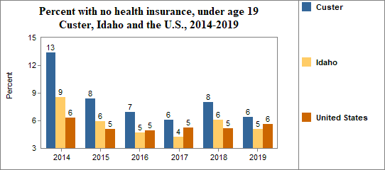 - 6.4 percent of children under the age of 19, or 49 children, had no health insurance coverage compared to 5.1 percent of all children in Idaho;