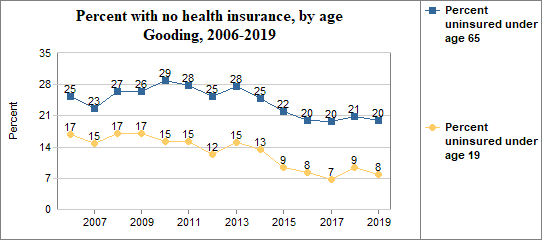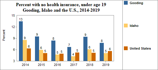 - 7.8 percent of children under the age of 19, or 322 children, had no health insurance coverage compared to 5.1 percent of all children in Idaho;