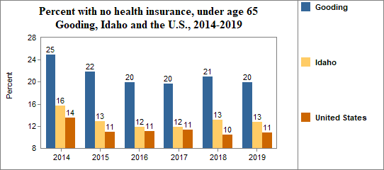 - 19.9 percent of the population under age 65, or 2,424.0 people, had no health insurance coverage compared to 12.7 percent in all of Idaho;