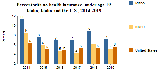 - 7.1 percent of children under the age of 19, or 234 children, had no health insurance coverage compared to 5.1 percent of all children in Idaho;