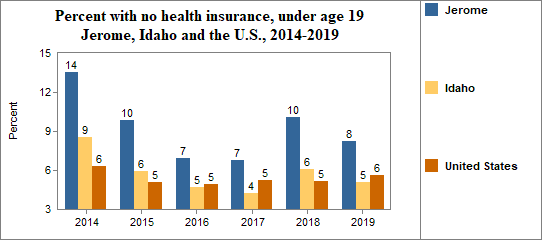 - 8.2 percent of children under the age of 19, or 613 children, had no health insurance coverage compared to 5.1 percent of all children in Idaho;