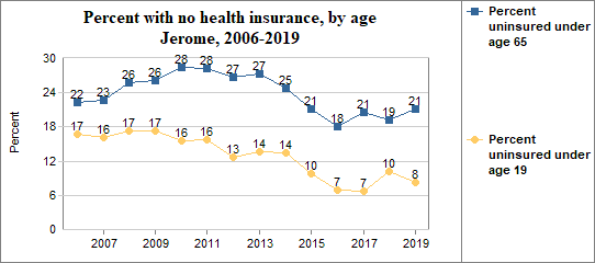 - 21.1 percent of the population under age 65, or 4,349.0 people, had no health insurance coverage compared to 12.7 percent in all of Idaho;