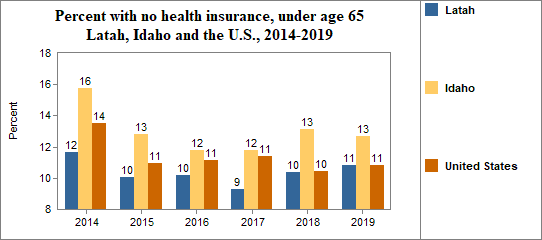 - 10.8 percent of the population under age 65, or 3,462.0 people, had no health insurance coverage compared to 12.7 percent in all of Idaho;
