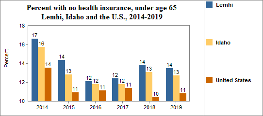 - 13.5 percent of the population under age 65, or 738.0 people, had no health insurance coverage compared to 12.7 percent in all of Idaho;
