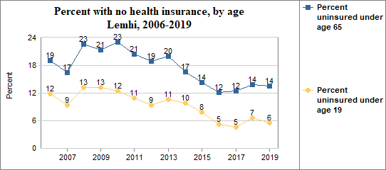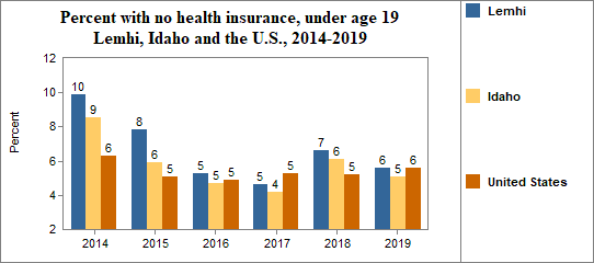 - 5.6 percent of children under the age of 19, or 86 children, had no health insurance coverage compared to 5.1 percent of all children in Idaho;