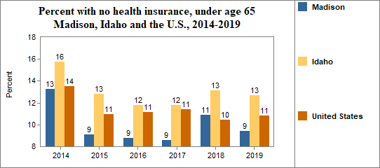 - 9.4 percent of the population under age 65, or 3,395.0 people, had no health insurance coverage compared to 12.7 percent in all of Idaho;