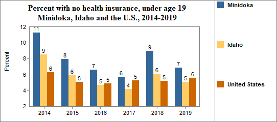 - 6.9 percent of children under the age of 19, or 420 children, had no health insurance coverage compared to 5.1 percent of all children in Idaho;