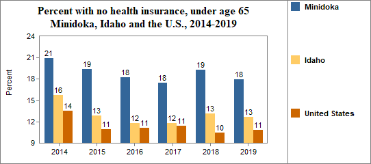 - 17.9 percent of the population under age 65, or 3,090.0 people, had no health insurance coverage compared to 12.7 percent in all of Idaho;