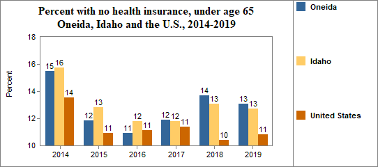 - 13.1 percent of the population under age 65, or 464.0 people, had no health insurance coverage compared to 12.7 percent in all of Idaho;