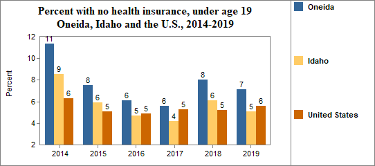 - 7.1 percent of children under the age of 19, or 94 children, had no health insurance coverage compared to 5.1 percent of all children in Idaho;
