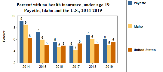 - 6.0 percent of children under the age of 19, or 383 children, had no health insurance coverage compared to 5.1 percent of all children in Idaho;