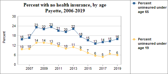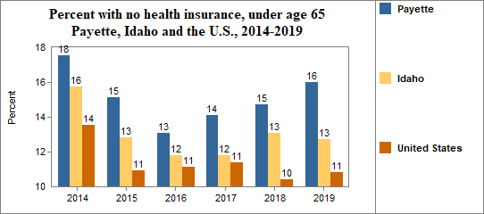 - 16.0 percent of the population under age 65, or 3,063.0 people, had no health insurance coverage compared to 12.7 percent in all of Idaho;