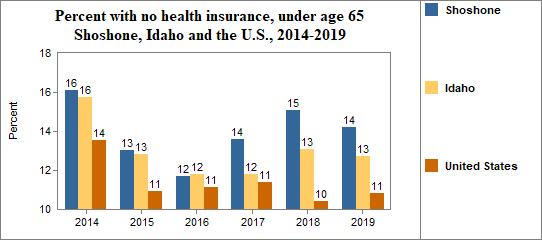 - 14.2 percent of the population under age 65, or 1,374.0 people, had no health insurance coverage compared to 12.7 percent in all of Idaho;