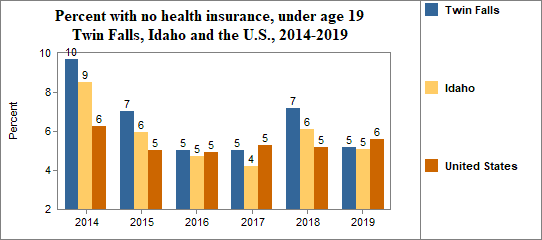 - 5.2 percent of children under the age of 19, or 1,267 children, had no health insurance coverage compared to 5.1 percent of all children in Idaho;