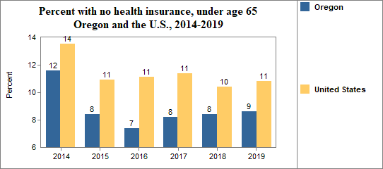 - 8.6 percent of the population under age 65, or 291,036.0 people, had no health insurance coverage compared to 10.8 percent in all of the U.S.;