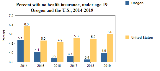 - 4.0 percent of children under the age of 19, or 35,486 children, had no health insurance coverage compared to 5.6 percent of all children in the U.S.;