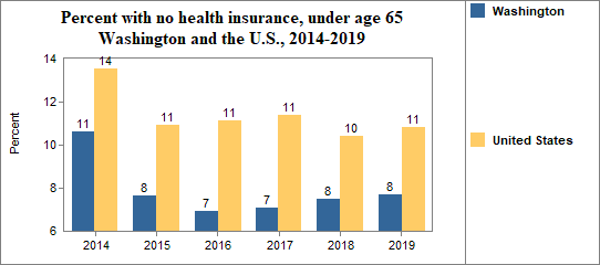 - 7.7 percent of the population under age 65, or 487,573.0 people, had no health insurance coverage compared to 10.8 percent in all of the U.S.;