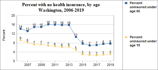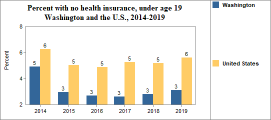 - 3.1 percent of children under the age of 19, or 53,726 children, had no health insurance coverage compared to 5.6 percent of all children in the U.S.;