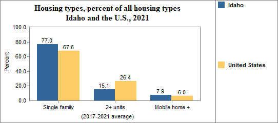 Housing types include single family homes, structures with two housing units (like duplexes), multiple units per structure (three or more units, such as apartment buildings), mobile homes and other housing types.