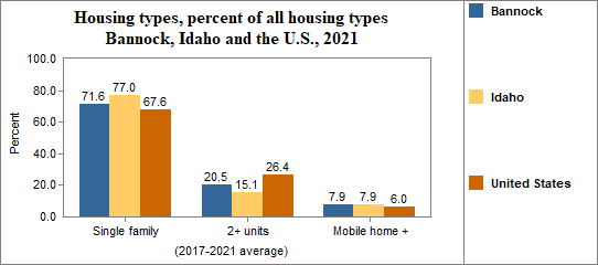 Housing types include single family homes, structures with two housing units (like duplexes), multiple units per structure (three or more units, such as apartment buildings), mobile homes and other housing types.
