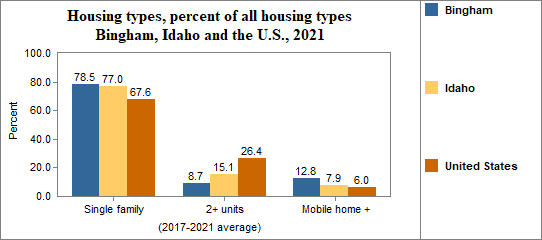 Housing types include single family homes, structures with two housing units (like duplexes), multiple units per structure (three or more units, such as apartment buildings), mobile homes and other housing types.