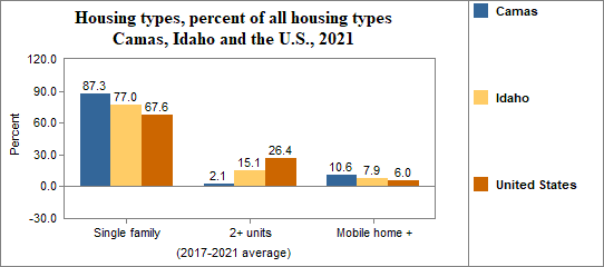 Housing types include single family homes, structures with two housing units (like duplexes), multiple units per structure (three or more units, such as apartment buildings), mobile homes and other housing types.
