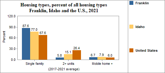 Housing types include single family homes, structures with two housing units (like duplexes), multiple units per structure (three or more units, such as apartment buildings), mobile homes and other housing types.
