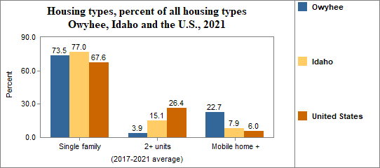 Housing types include single family homes, structures with two housing units (like duplexes), multiple units per structure (three or more units, such as apartment buildings), mobile homes and other housing types.