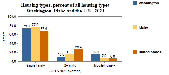 Housing types include single family homes, structures with two housing units (like duplexes), multiple units per structure (three or more units, such as apartment buildings), mobile homes and other housing types.