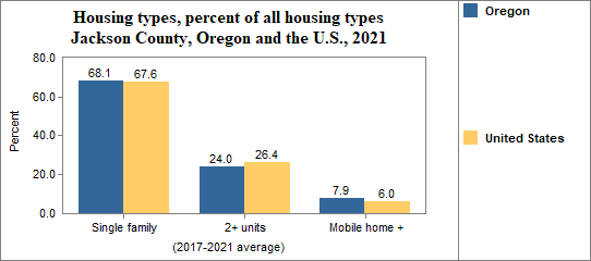 Housing types include single family homes, structures with two housing units (like duplexes), multiple units per structure (three or more units, such as apartment buildings), mobile homes and other housing types.