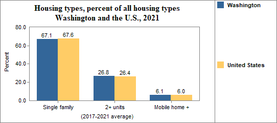 Housing types include single family homes, structures with two housing units (like duplexes), multiple units per structure (three or more units, such as apartment buildings), mobile homes and other housing types.