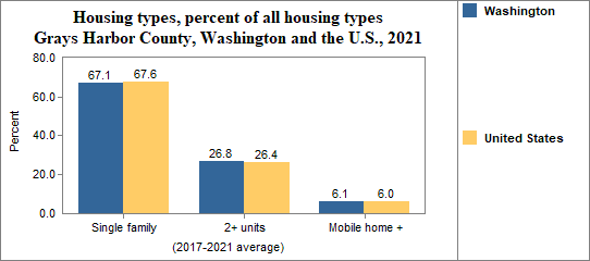 Housing types include single family homes, structures with two housing units (like duplexes), multiple units per structure (three or more units, such as apartment buildings), mobile homes and other housing types.