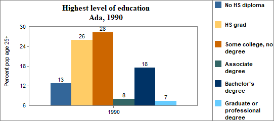 In Ada . . . - 9 percent of the population 25 years and older in 2000 had no high school diploma, compared to 15 percent in Idaho