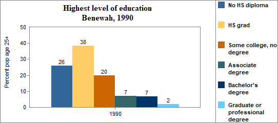 In Benewah . . . - 20 percent of the population 25 years and older in 2000 had no high school diploma, compared to 15 percent in Idaho