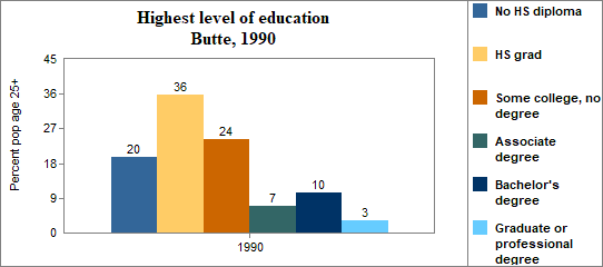 In Butte . . . - 17 percent of the population 25 years and older in 2000 had no high school diploma, compared to 15 percent in Idaho