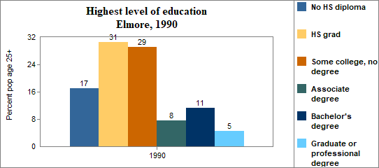 In Elmore . . . - 13 percent of the population 25 years and older in 2000 had no high school diploma, compared to 15 percent in Idaho