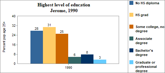 In Jerome . . . - 25 percent of the population 25 years and older in 2000 had no high school diploma, compared to 15 percent in Idaho